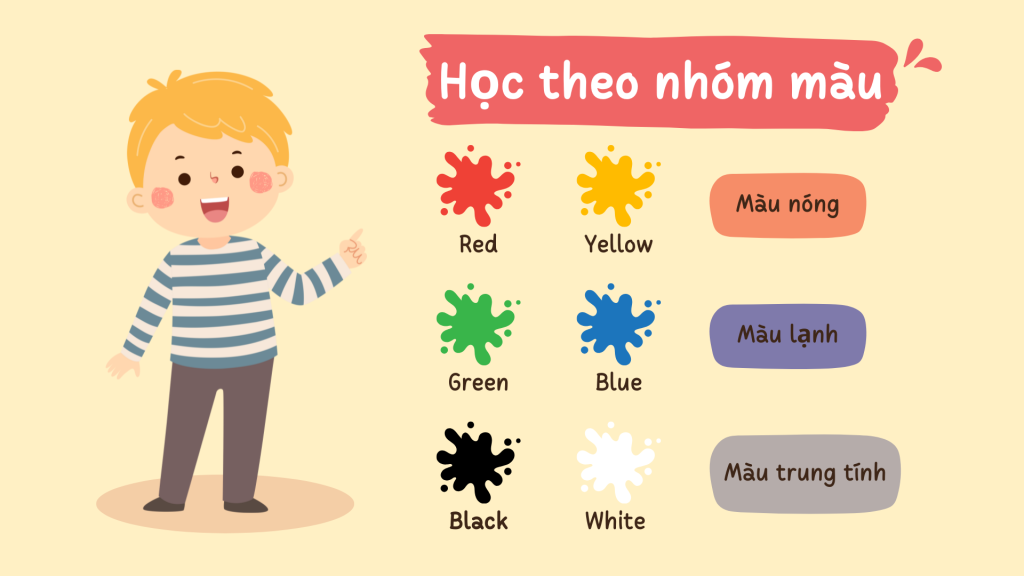 Việc chia nhóm màu giúp trẻ dễ phân biệt và ghi nhớ hơn. Bố mẹ có thể chia thành:
