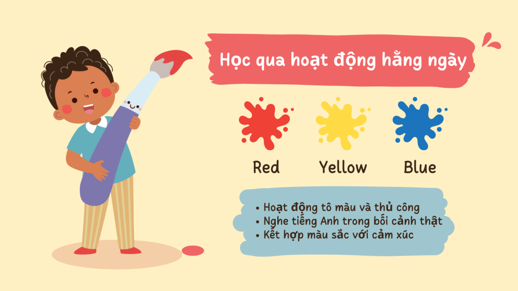 Khi học, hãy cho trẻ nhìn – chạm – gọi tên đồ vật thật. Ví dụ, khi học nhóm màu nóng, có thể dùng quả cam (orange), quả ớt (red), trái chuối (yellow). Cách học này giúp trẻ liên kết từ vựng với thế giới thực xung quanh.