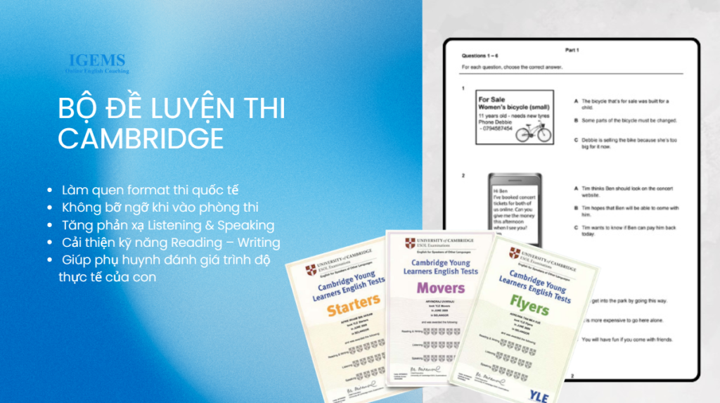 👉 IGEMS hỗ trợ kiểm tra trình độ & tư vấn lộ trình luyện đề Cambridge miễn phí cho phụ huynh.