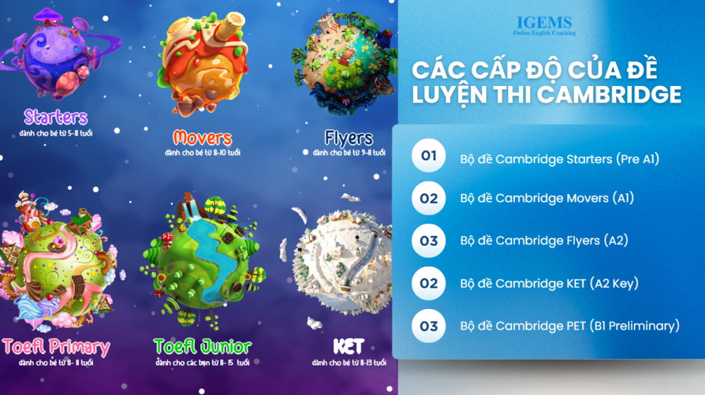 Tổng hợp bộ đề luyện thi Cambridge từ Starters đến PET: cấu trúc, cách luyện hiệu quả và trải nghiệm Phòng luyện thi Cambridge online của IGEMS.