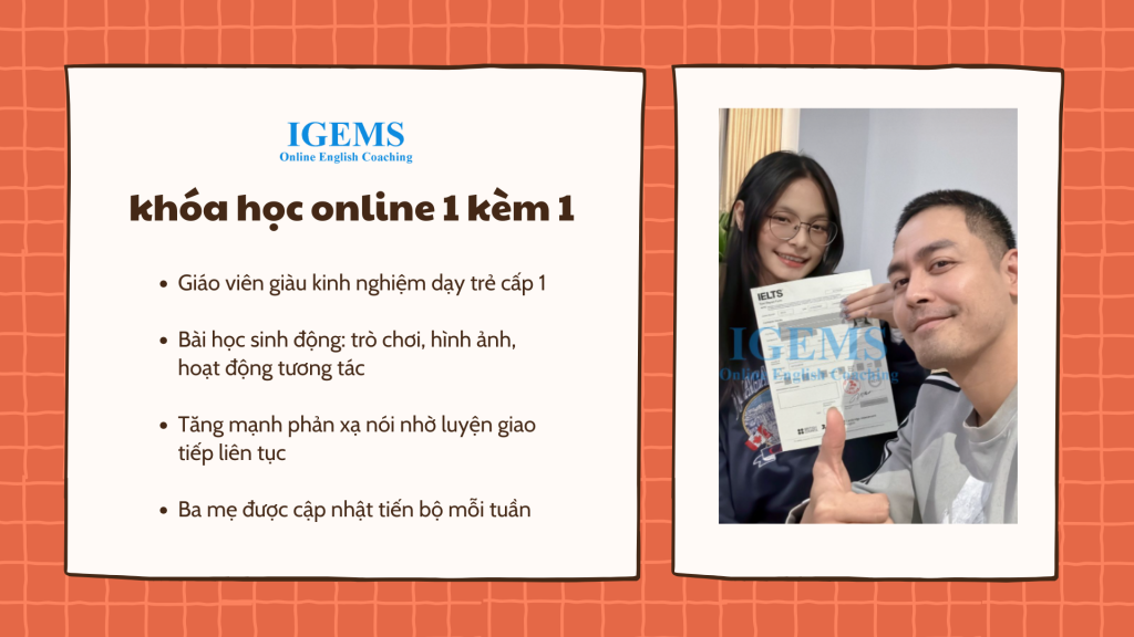 Nếu ba mẹ đang tìm một chương trình học tiếng anh online lớp 3 giúp con tiến bộ nhanh – tự tin nói – nắm chắc nền tảng, khóa học tiếng Anh online 1 kèm 1 của IGEMS có thể là lựa chọn phù hợp.