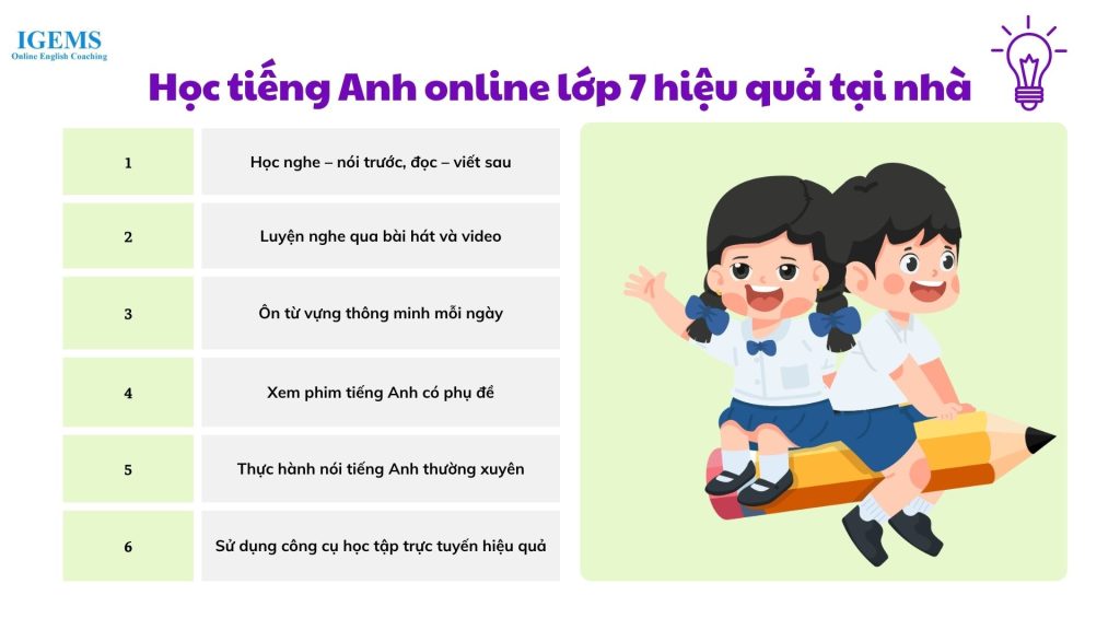 Để giúp học sinh lớp 7 học tiếng Anh online hiệu quả, IGEMS gợi ý phụ huynh và học sinh nên áp dụng những phương pháp sau: