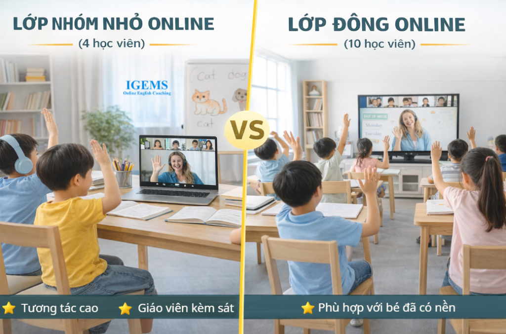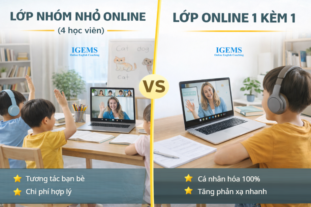 👉 Tuy nhiên, với những bé cần cải thiện nhanh hoặc mất gốc, 1 kèm 1 vẫn là lựa chọn tối ưu hơn.