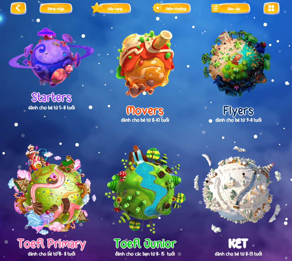 Phù hợp với học sinh tiểu học và THCS đang bắt đầu học tiếng Anh hoặc chuẩn bị thi chứng chỉ Starters – Movers – Flyers.
