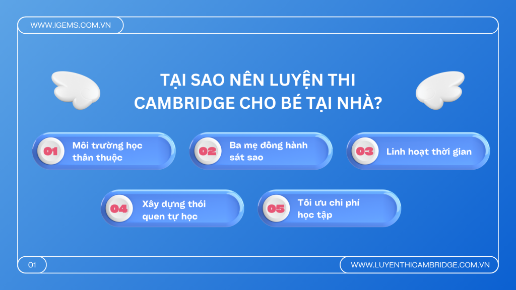 Việc luyện thi Cambridge cho bé là bước quan trọng giúp con xây dựng nền tảng tiếng Anh vững chắc và đạt được chứng chỉ quốc tế có giá trị toàn cầu. Tuy nhiên, không phải lúc nào phụ huynh cũng có điều kiện đưa con đến trung tâm mỗi ngày. Vì vậy, luyện thi Cambridge tại nhà trở thành giải pháp tối ưu – vừa tiết kiệm thời gian, vừa giúp con học tập trong môi trường quen thuộc và thoải mái.