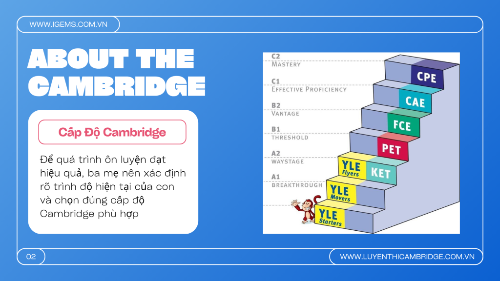 Để quá trình ôn luyện đạt hiệu quả, ba mẹ nên xác định rõ trình độ hiện tại của con và chọn đúng cấp độ Cambridge phù hợp: