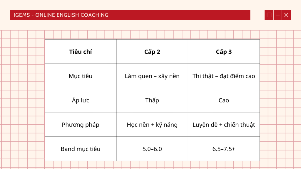 - Cấp 2: xây nền – làm quen – không áp lực