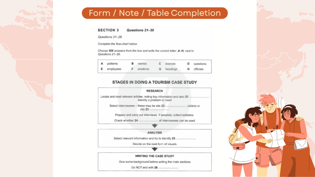 • Form / Note / Table Completion: Điền thông tin còn thiếu.