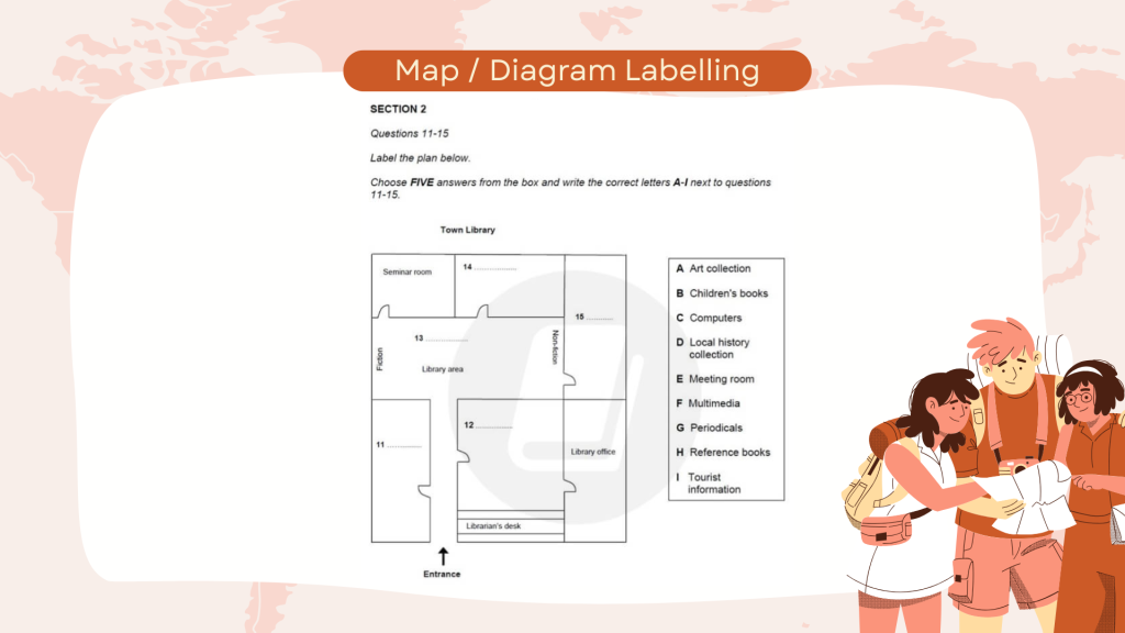• Map / Diagram Labelling: Nghe mô tả vị trí, tên địa điểm.