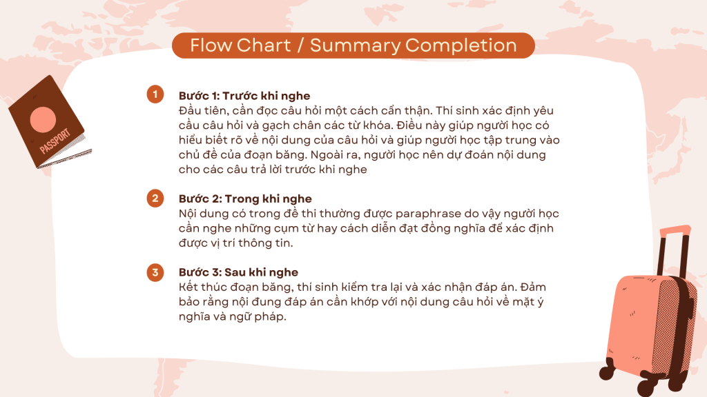 • Flow Chart / Summary Completion: Hoàn thành sơ đồ hoặc tóm tắt thông tin.
