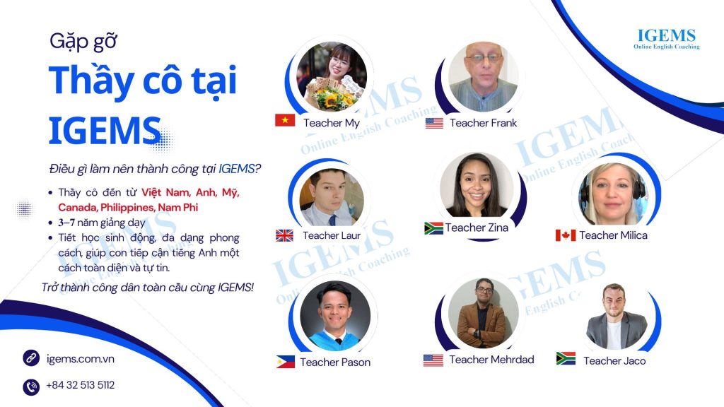 IGEMS là trung tâm Coaching tiếng Anh online hàng đầu Việt Nam thuộc hệ thống anh ngữ quốc tế GEMS EDU. Chương trình học tiếng Anh online 1 kèm 1 hàng đầu Việt Nam tới từ hệ thống Anh ngữ quốc tế GEMS EDU đối tác độc quyền tại Việt Nam của tổ chức giáo dục QUANTUM LEARNING ở Mỹ. IGEMS có đội ngũ giáo viên có kinh nghiệm lâu năm, tâm huyết với nghề và tận tâm với học viên, đến từ nhiều quốc gia trên thế giới như Anh, Mỹ, Canada, Philippines, Nam Phi, Việt Nam,…