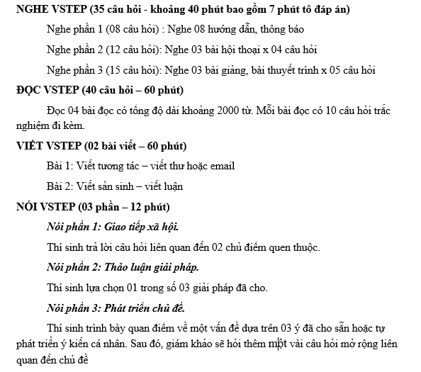 - Writing: 2 bài viết (thư & luận), 60 phút