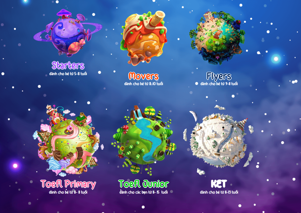 - Danh sách cấp độ: Starters – Movers – Flyers – KET – PET