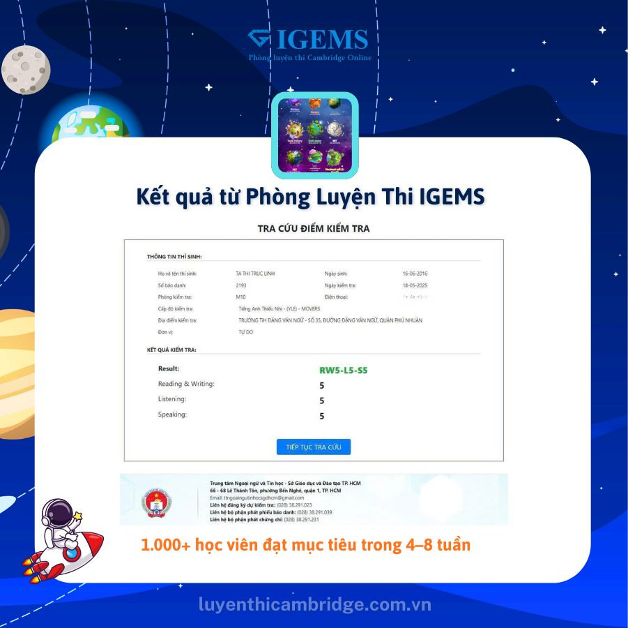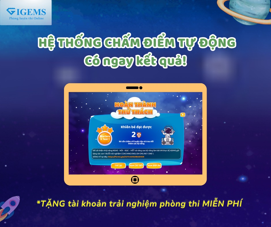 🎁 Đăng ký ngay để nhận tài khoản trải nghiệm miễn phí Phòng luyện thi Cambridge Online tại IGEMS và giúp con làm quen với đề thi thật trước kỳ thi chính thức.